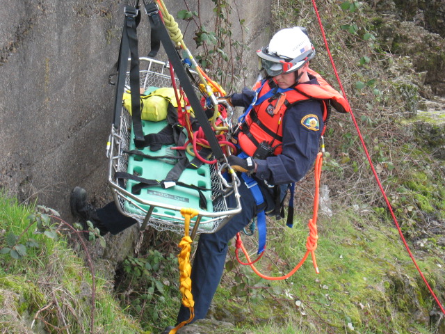 The many steep cliffs lining the Clackamas River present an ongoing danger to the public. Swimmers looking for a swimming spot or a fisherman looking for a new fishing hole on the river can quickly find themselves trapped in a dangerous spot. Other times it can be a worker high up on a radio tower or on a construction site that needs assistance. Training to use ropes to reach injured people high off the ground, securing them and then bring them to safety, that is the essence of vertical rescue.